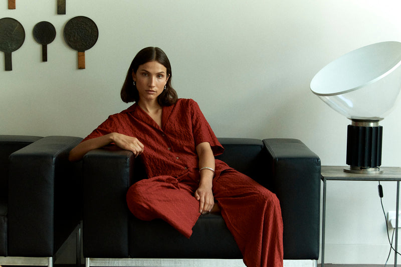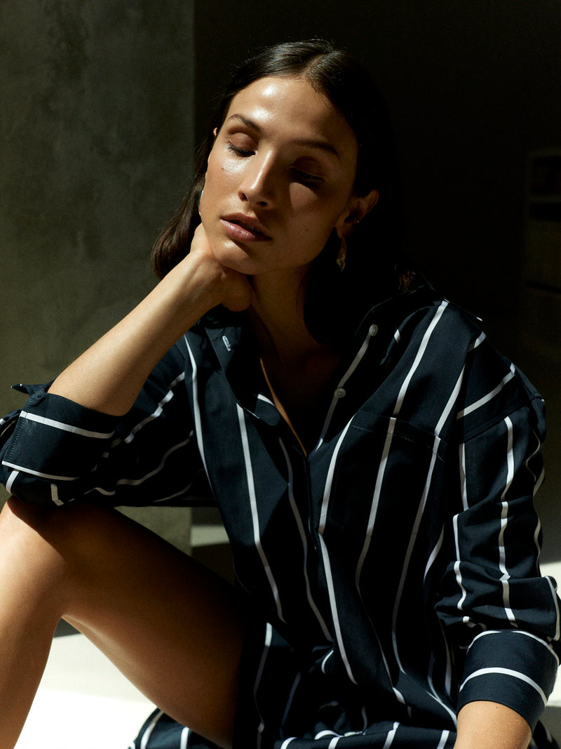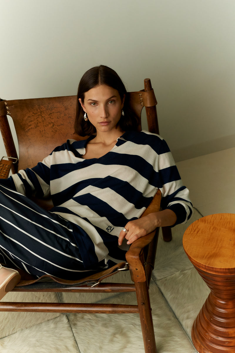 Our exclusive signature stripes are woven in Italy and remerge this season across twin sets, shorts, trousers and shirts. The fabric is crafted by a specialist mill in Lake Como which is focused on artisanal craft and sustainable practices; take a look behind closed doors in this journal entry.