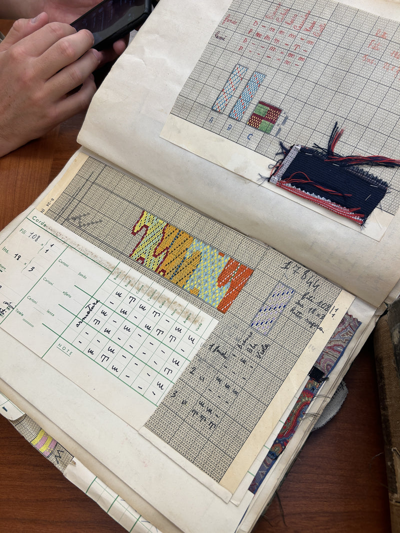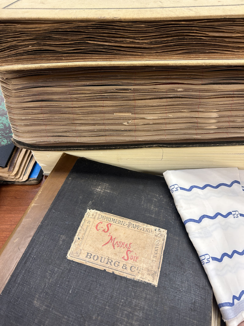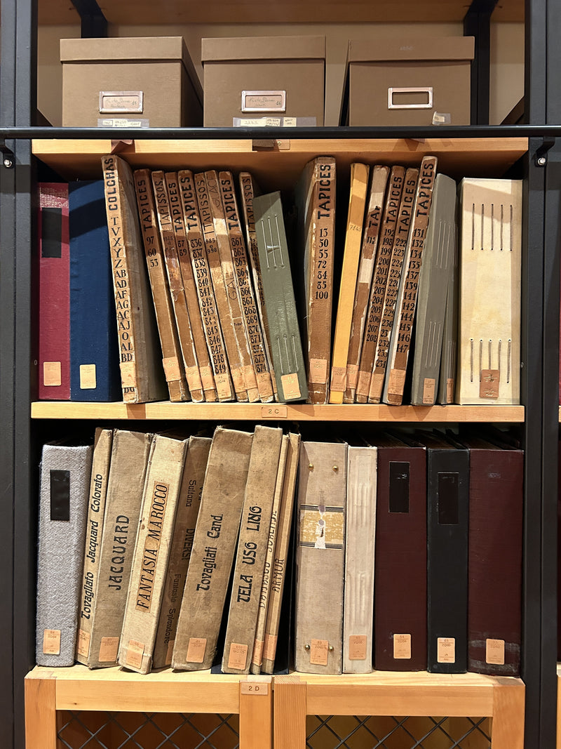 Above the workshop, the mill has an archive of fabrications and textile books that date to the 1800s. The shelves are stacked high with compilations of stripes, monograms, military materials, and illustrations. Artefacts of artistry.