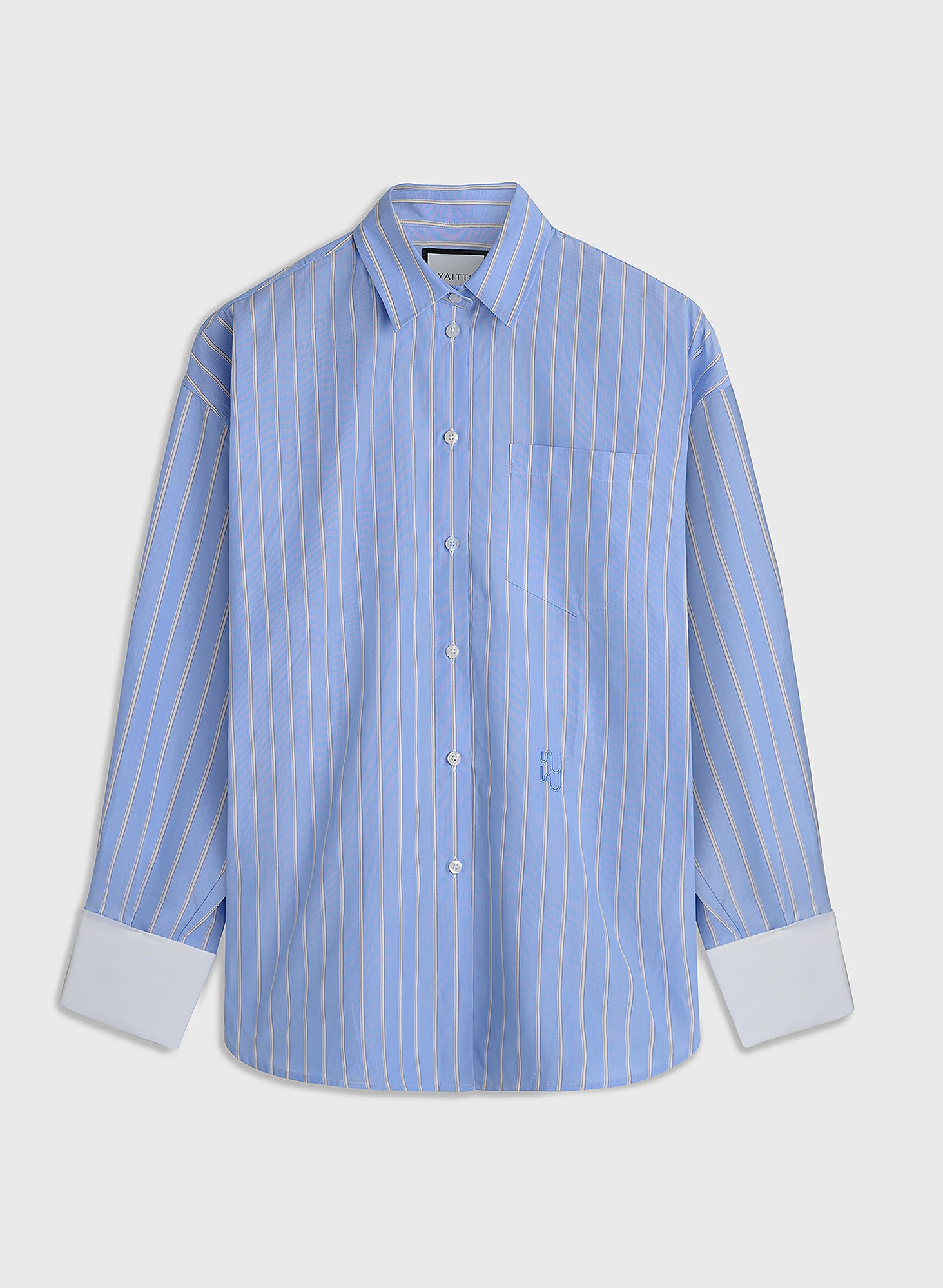 Crafted from 100% Japanese cotton that's patterned with a distinct blue stripe, inspired from traditional pajama styles. Our new FARO style is longer line, with a contrast white double cuff featuring our YAITTE monogram. Pair back with the matching JANEIRO trousers or PALMA shorts.